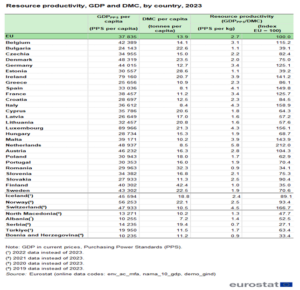 Productivitatea (utilizării) resurselor este, practic, un indicator privind nivelul de dezvoltare și de sofisticare al economiei. Expresia sa matematică este raportul dintre PIB/locuitor (la standardul puterii de cumpărare, deci în cifre comparabile) și consumul material intern (DMC- domestic material consumption). Deci, cu cât o economie produce mai mulți bani dintr-o cantitate dată de resurse consumată, cu atât este mai productivă. Cu alte cuvinte, firmele românești produc de patru ori mai puțini bani consumând aceeași cantitate de resurse precum firmele germane sau franceze și doar jumătate din ce produc ungurii sau polonezii când consumă aceleași resurse!