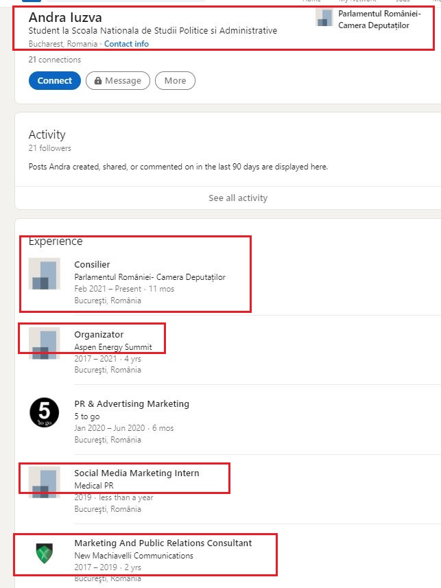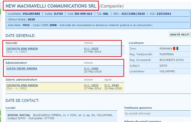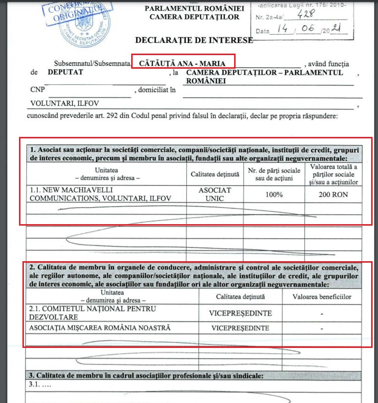Vicepreședintele Camerei Deputaților, Ana-Maria Catauta, deține o firmă, “New Machiavelli Communications”, iar administrator și asociat în această firmă este o anume doamnă Andra Irene Iuzva. Aceasta este studentă, coordonator al summit-ului Aspen Energy și, întâmplător, sau nu, este de la începutul acestui an CONSILIER tot la CAMERA DEPUTAȚILOR.