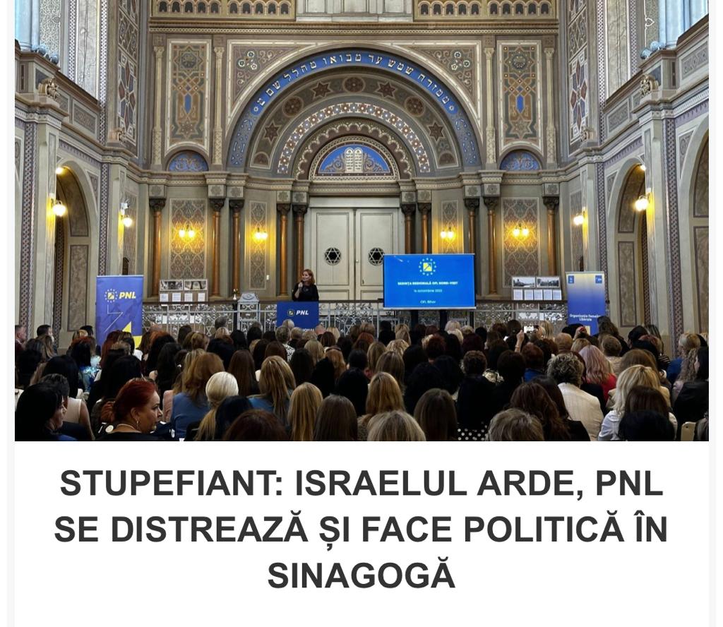 În weekend-ul care a trecut, ea a participat la întâlnirea femeilor liberale la Oradea, regiunea de nord-vest, unde Ilie Bolojan și cu dânsa au avut ideea creață ca această întâlnire să fie organizată în celebra sinagogă din centrul orașului, proaspăt renovată. Am vizitat și eu sinagoga în această vară, este un monument arhitectonic foarte frumos, ce funcționează în regim de muzeu. Ce-am priceput eu este că acest cuplu ad-hoc de deștepți, Gorghiu și Bolojan, a considerat că în acest fel, vezi, Doamne, ar semnaliza politic că ei sunt pro-israelieni, adică și liberalii merg sub deviza „we stand with Israel”. Mă gândesc, totuși, că o fi organizat și un moment de reculegere pe la început, firesc și acesta după atâția morți; dacă n-au făcut-o, atunci treaba e și mai groasă în ceea ce îi privește.