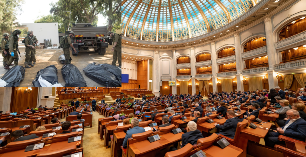 Deputatul AUR Ringo Dămureanu, care este și secretarul Parlamentului României, a dezvăluit astăzi într-o conferință de presă la Craiova că a fost invitată în Israel o delegație din România, condusă de Alfred Simonis. În această delegație trebuia să fie un membru din fiecare partid, însă AUR-ului i-a fost refuzată participarea. Întors din Israel, Simonis a luat decizia de unul singur ca următoarea zi, marți, să se organizeze ședința secretă din Parlament. Art. 33, al. 1 din „Regulamentul activităţilor comune ale Camerei Deputaţilor şi Senatului”, spune: „Deputaţii şi senatorii sunt obligaţi să fie prezenţi la lucrările comune ale Camerei Deputaţilor şi Senatului şi să se înscrie pe lista de prezenţă a şedinţei comune, ţinută de secretari”, ceea ce înseamnă că parlamentarii români au fost obligați să vizioneze ororile comise în războiul din Orient și proiectate în Parlamentul transformat în cinematograf.