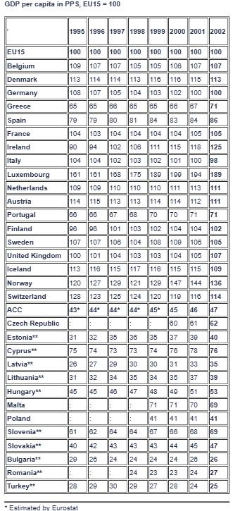 În anul în care a apărut moneda comună euro) situația economică la nivel european era următoarea în țările foste socialiste: Polonia 41% din media UE-15, Cehia 62%, Ungaria 53%, Slovacia 47%, Estonia 40%, Lituania 39%, Letonia 35%, România 27%, Bulgaria 26%.