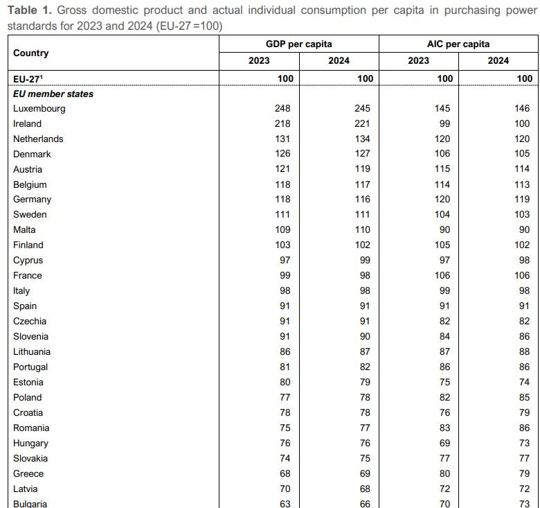 Dintre aceste state, unele au trecut la euro (statele baltice, Slovacia, Bulgaria, Croația), alegând politicile descrise ca fiind potrivite de către noul lăudător al lui Bolojan, trimisul lui Isărescu la TV, Valentin Lazea. Hai să vedem unde ne aflăm acum, după ultimele date complete, cele din 2024: Polonia 78% din media UE, Cehia 91%, Ungaria 76%, Slovacia 75%, Estonia 79%, Lituania 87%, Letonia 68%, România 77%, Bulgaria 66%.