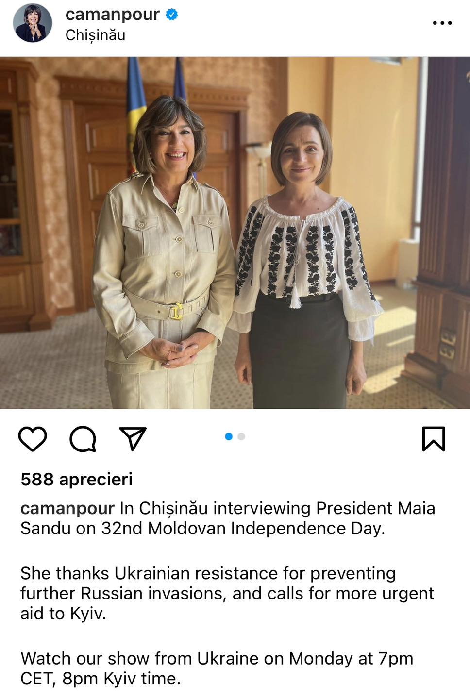 CNN a marcat momentul trimițând-o pe veterana Christiane Amanpour să realizeze un interviu omagial cu Sandu, unde să reamintească că aceasta e favorita SUA, mai ales a lui Joe Biden. Bucuria mare de la Chișinău, pentru o așa de mare onoare, a fost umbrită total de faptul că vecinul Zelenskiy n-a felicitat-o ieri pe Maia Sandu, în zadar au așteptat vreun mail sau postare de la Kiev care să pomenească ceva despre sărbătoarea Moldovei. Tristețe și nedumerire profunde din partea Maiei Sandu și alor săi!