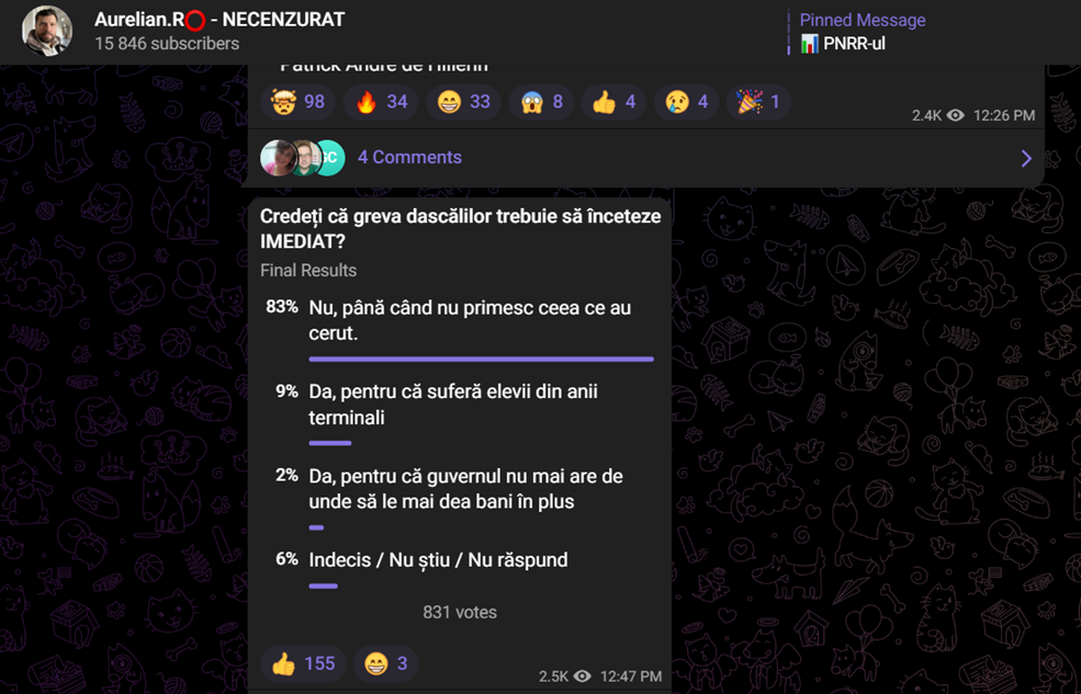 Aurelian Popa este de părere că greva este aproape de final, pentru că guvernul va ceda și le va oferi profesorilor ceea ce au cerut. S-a sedimentat o sămânță a solidarizării în societatea românească. Pe canalul său de Telegram, Aurelian Popa a realizat un sondaj cu privire la greva profesorilor, întrebându-și abonații dacă această inițiativă ar trebui să se oprească sau nu. Iată care au fost răspunsurile: