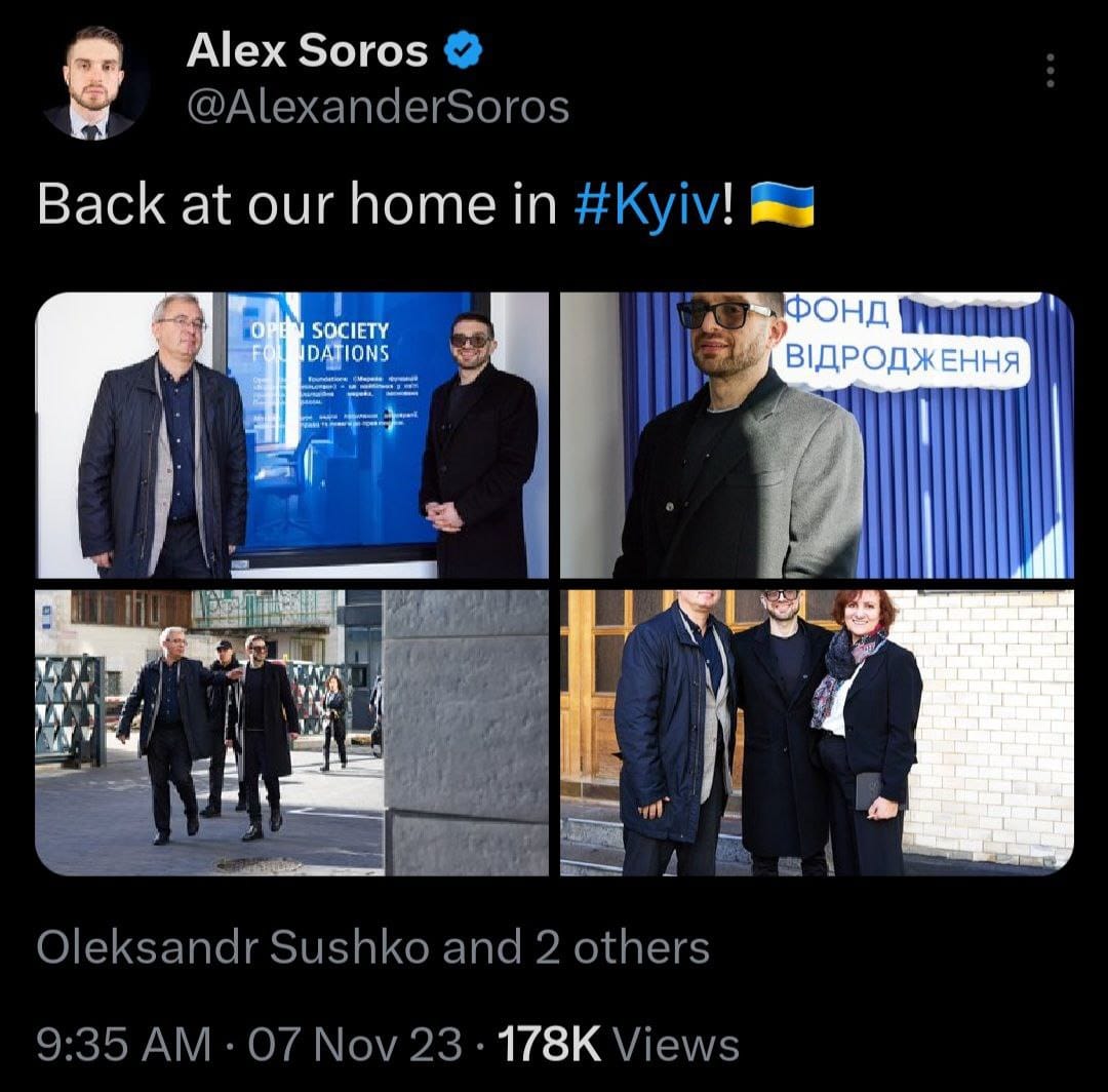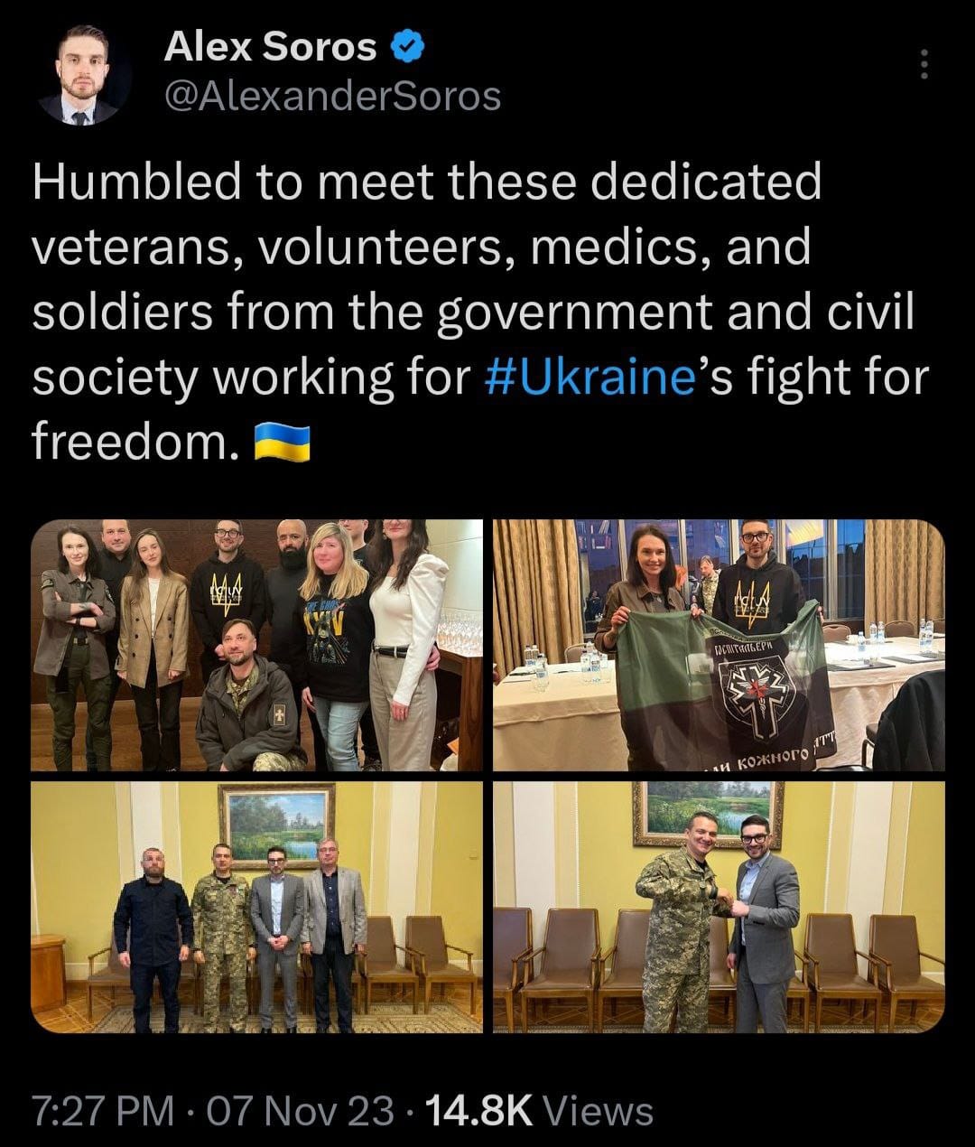 Se pare că președintele Iohannis nu este singurul plimbăreț. Ieri, Alex Soroș, fiul lui George Soros, s-a dus în Ucraina pentru a se întâlni cu veterani, voluntari, medici și soldați din guvernul ucrainean și din societatea civilă a Ucrainei. Soros Jr. s-a pozat cu un steag cu inscripții ale armatei ucrainene, a postat pe Twitter (X) imagini cu agenți guvernamentali, ONG-iști, soldați și medici și chiar cu reprezentanți ai Guvernului ucrainean la sediul Open Society Foundation.