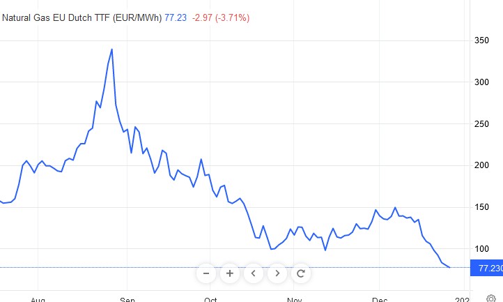 Contractul futures TTF a coborât la 76,18 euro pe megawat oră, de la maxim record din vară: 345 euro pe megawat oră.