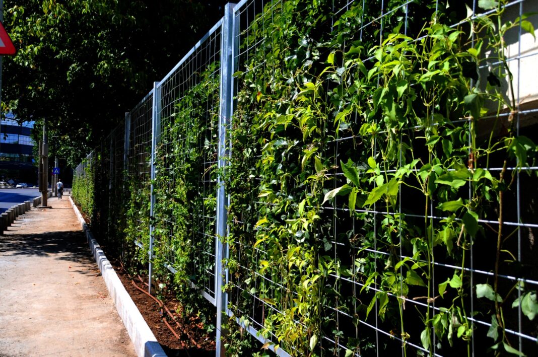 Spațiu verde creat pe verticală, cu plasă de plante agățătoare. Soluția a fost găsită de o administrație de sector pentru a reduce poluarea și de a masca gardurile urâte de beton acolo unde nu se poate renunța la ele.