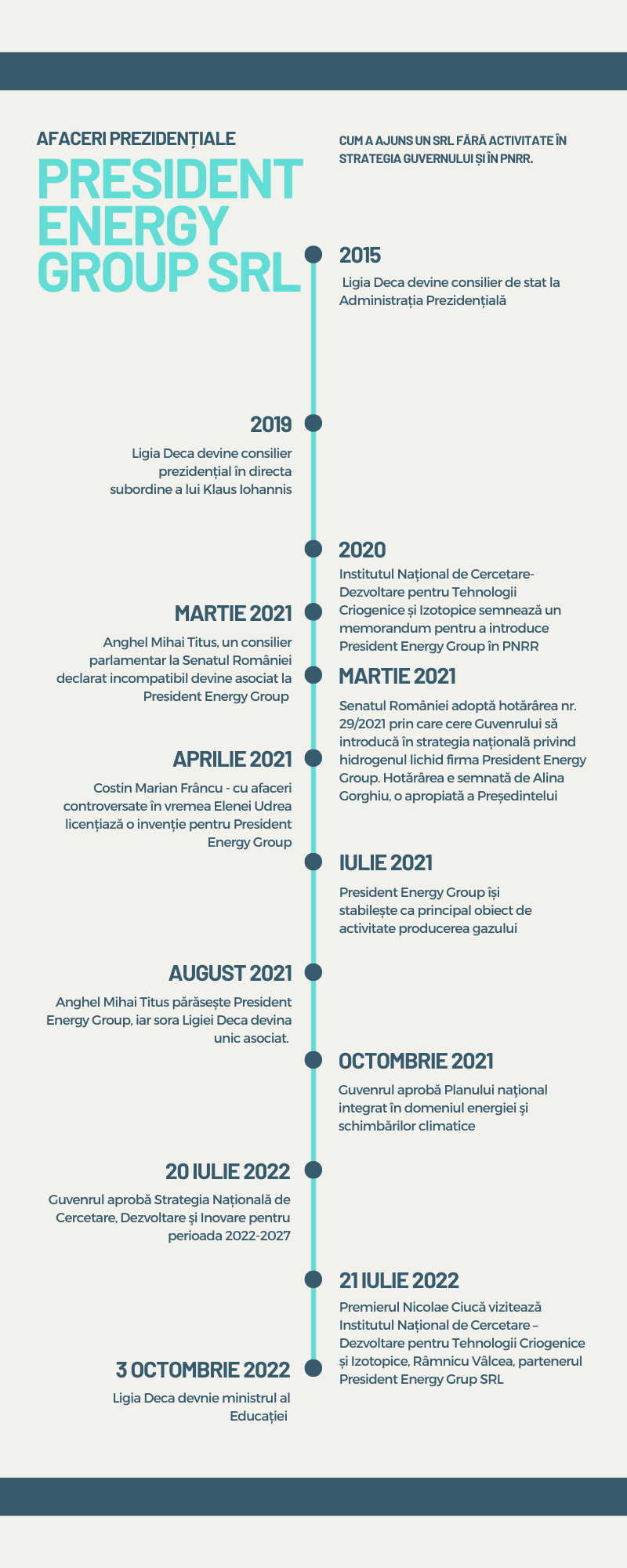Deși are un nume pompos, President Energy Grup nu a avut o activitate spectaculoasă în afaceri. Cu toate acestea, sora ministrului educației a reușit un lucru spectaculos. President Energy Grup SRL a semnat un memorandum cu Institutul Național de Cercetare-Dezvoltare pentru Tehnologii Criogenice și Izotopice.