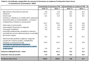 - Activitățile profesionale, științifice și tehnice; activități de servicii administrative și activități de servicii suport (7,6% din PIB) au cunoscut și acestea o contribuție negativă (-0,1%) la creșterea de pe semestrul I al anului acesta;
