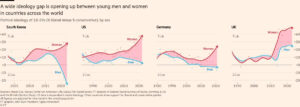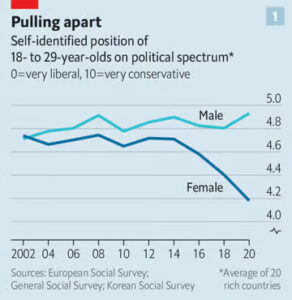 Un fenomen social nou, puțin spre deloc discutat în România, dar dezbătut în toate publicațiile internaționale serioase, este polarizarea politică în rândul tinerilor. Mai multe studii și sondaje publicate în ultimele luni demonstrează că, pentru prima dată în istorie, există o diferență netă și semnificativă între preferințele politice ale tinerelor și tinerilor: femeile au devenit din ce în ce mai liberale, în timp ce bărbații se transformă în conservatori (https://www.ft.com/content/29fd9b5c-2f35-41bf-9d4c-994db4e12998; https://www.dazeddigital.com/life-culture/article/61857/1/young-men-are-more-conservative-than-boomers-study-says; https://www.kcl.ac.uk/news/masculinity-and-womens-equality-study-finds-emerging-gender-divide-in-young-peoples-attitudes). Am inclus mai jos graficele ce rezumă rezultatele studiilor, acestea arătând că, după o lungă istorie de opinii politice relativ similare între genuri, acum există o diferență de cca 30 de procente în opțiunile legate de spectrul politic. În trecut femeile au fost chiar mai conservatoare decât bărbații, cauzele fiind legătura lor mai strânsă cu biserica, respectiv rolul lor de mame, mai preocupate de o educație corectă a copiilor, deci schimbarea înregistrată azi este chiar mai drastică. Studiile citate de mine nu au inclus și tinerii din România, ci doar tineri din SUA, Marea Britanie, Germania și Coreea de Sud, dar considerând produsele media pe care le consultă și consumă tinerii români astăzi, e corect să credem că și la noi rezultatele sunt similare.