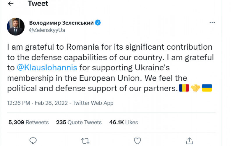 Președintele ucrainean Zelenski mulțumește țării noastre pentru ”contribuția semnificativă la capacitatea de apărare a țării mele” într-o postare pe Twitter. Liderul de la Kiev a mai specificat că: ”îi sunt recunoscător președintelui Iohannis pentru susținerea aderării Ucrainei la Uniunea Europeană (UE). Simțim susținerea politică și de apărare a partenerilor noștri”.