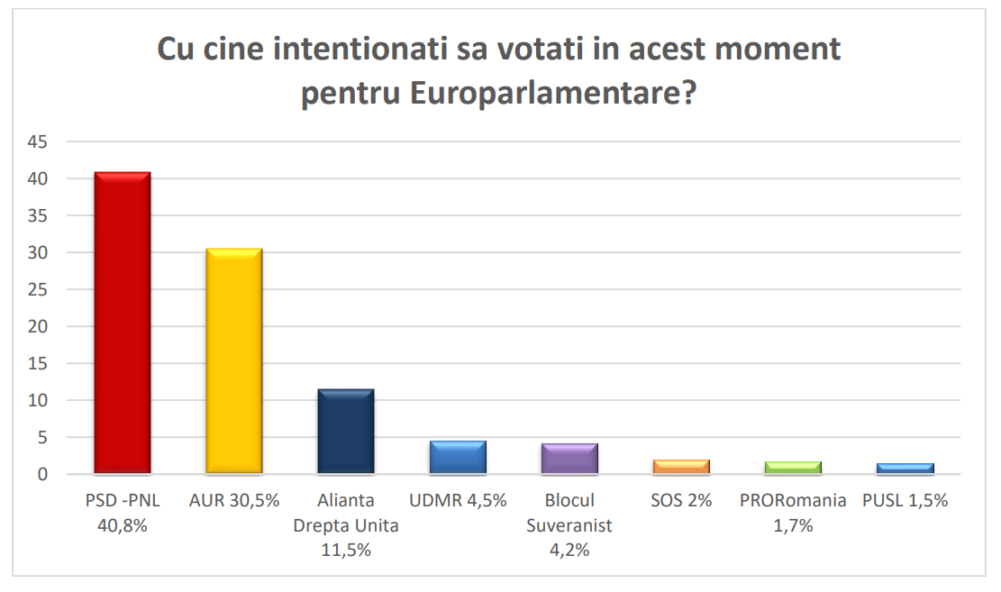 Date-bombă în cel mai recent sondaj privind scorurile electorale pe care le-ar putea obține formațiunilor politice la viitoarele alegeri. Este prima sondare a opiniei publice după anunțul privind comasarea alegerilor locale cu cele europarlamentare, iar marea surpriză este creșterea partidului AUR, condus de George Simion, arată datele sondajul INSOMAR prezentate de Realitatea Plus.