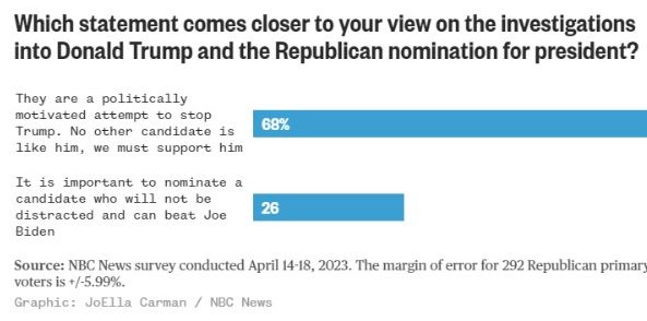 68% dintre alegătorii primari ai Partidului Republican sunt de acord cu afirmația că investigațiile privind Trump sunt motivate politic și sunt concepute pentru a-l împiedica să devină din nou președinte și că trebuie să-l sprijine acum pentru a-i împiedica pe adversarii săi să câștige.