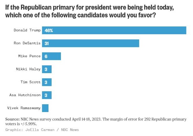 Ei sunt urmați de fostul vicepreședinte Mike Pence cu 6% și de fostul guvernator al Carolinei de Sud și Ambasadorul SUA la ONU Nikki Haley, senatorul Tim Scott, R-S.C. (care explorează o ofertă din 2024) și fostul guvernator al statului Arkansas, Asa Hutchinson, care este la egalitate cu 3%. Omul de afaceri Vivek Ramaswamy are 2%.