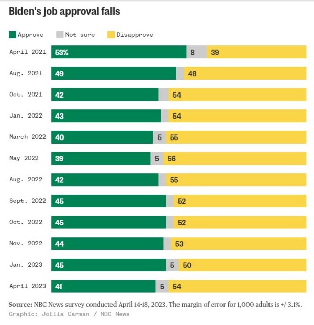 Sondajul NBC News a constatat că 41% dintre alegătorii înregistrați au declarat că ar vota cu siguranță sau probabil pentru Biden în alegerile generale, față de 47% care spun că ar vota pentru eventualul candidat republican.