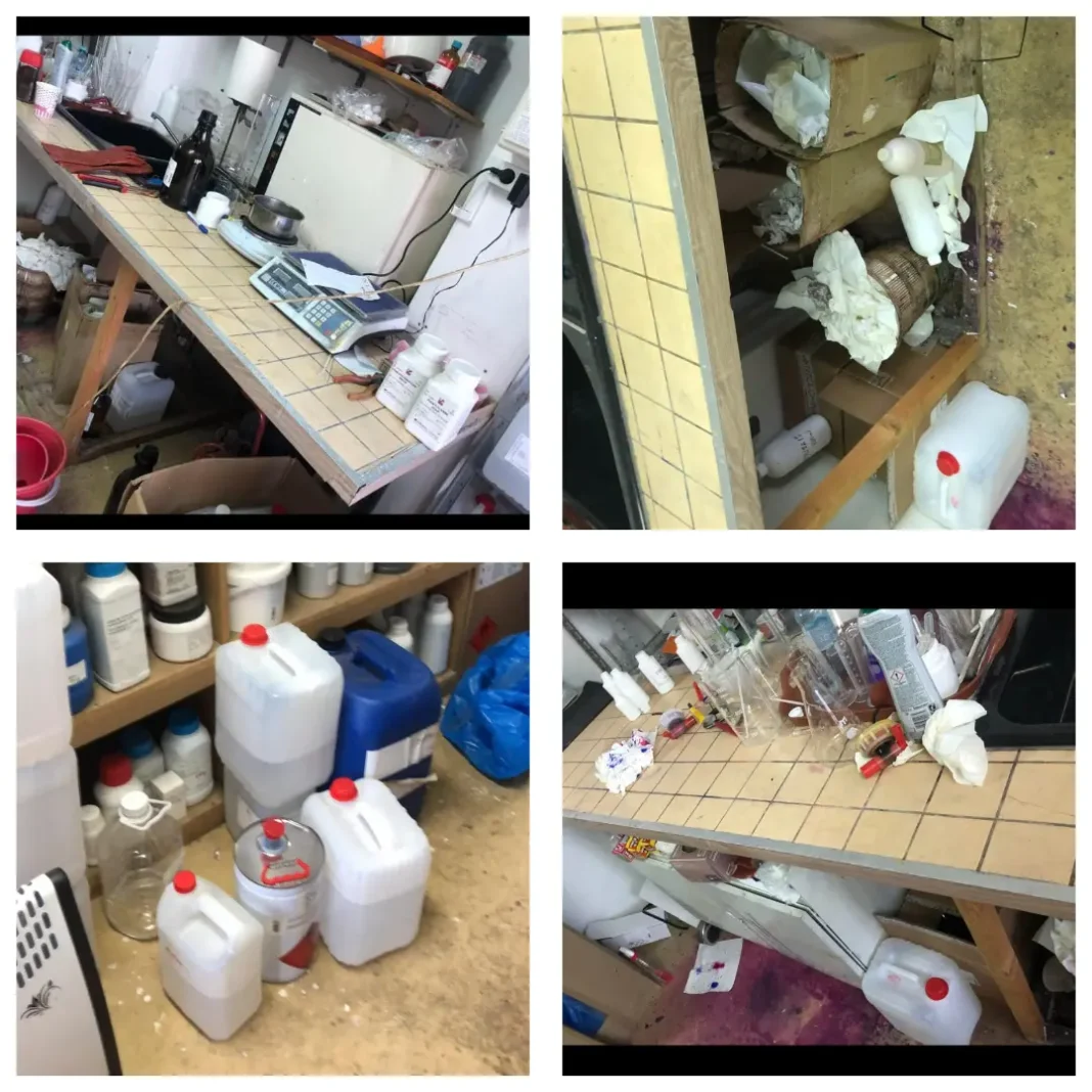 La descinderile din 2023, anchetatorii au găsit un peisaj de coșmar: 1.233 de recipiente cu produse chimice și farmaceutice expirate, fără etichete sau cu termene de valabilitate mâzgălite manual, depozitate claie peste grămadă.