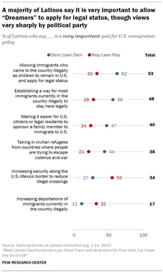 Potrivit unui raport recent al Pew Research, hispanicii văd în majoritate Democrații ca partidul care muncește mai mult pentru a-și câștiga alegătorii și îi pasă mai mult de ceea ce cred aceștia. Nu a existat practic nici o schimbare în afilierea la partid din 2019 până în 2022, aproape de două ori mai mulți hispanici numindu-se democrați decât republicani. În timp ce 80% dintre cei chestionați spun că economia este o problemă foarte importantă în termeni medii, 57% spun că avortul ar trebui să fie legal în toate sau în majoritatea cazurilor. Acest lucru este ușor mai redus ca pondere decât pentru populația generală.