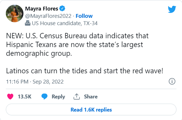 În iunie, republicana Mayra Flores a câștigat alegerile speciale într-un district de frontieră din Texasul de Sud. Oponentul său democrat în viitorul termen mediu, congresmanul Vicente Gonzalez, care s-a mutat în districtul ei dintr-un district devenit majoritar republican, a declarat că partidul național “asimilează de drept latinii din Texasul de Sud”. În cursa pentru alegerile speciale a doamnei Flores, republicanii au mizat pe tema securității frontierelor, nu pe amnistie. A funcționat. Districtul este 84% hispanic.