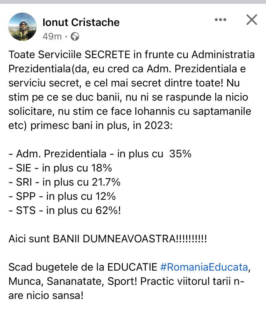 „Toate Serviciile SECRETE în frunte cu Administrația Prezidențială (da, eu cred ca Adm. Prezidențială e serviciu secret, e cel mai secret dintre toate! Nu știm pe ce se duc banii, nu ni se răspunde la nicio solicitare, nu știm ce face Iohannis cu săptămânile etc) primesc bani în plus, în 2023:
