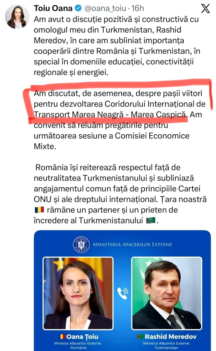 Septembrie 2025 – Oana Țoiu reia discuțiile diplomatice la nivel înalt despre Coridorul Caspic